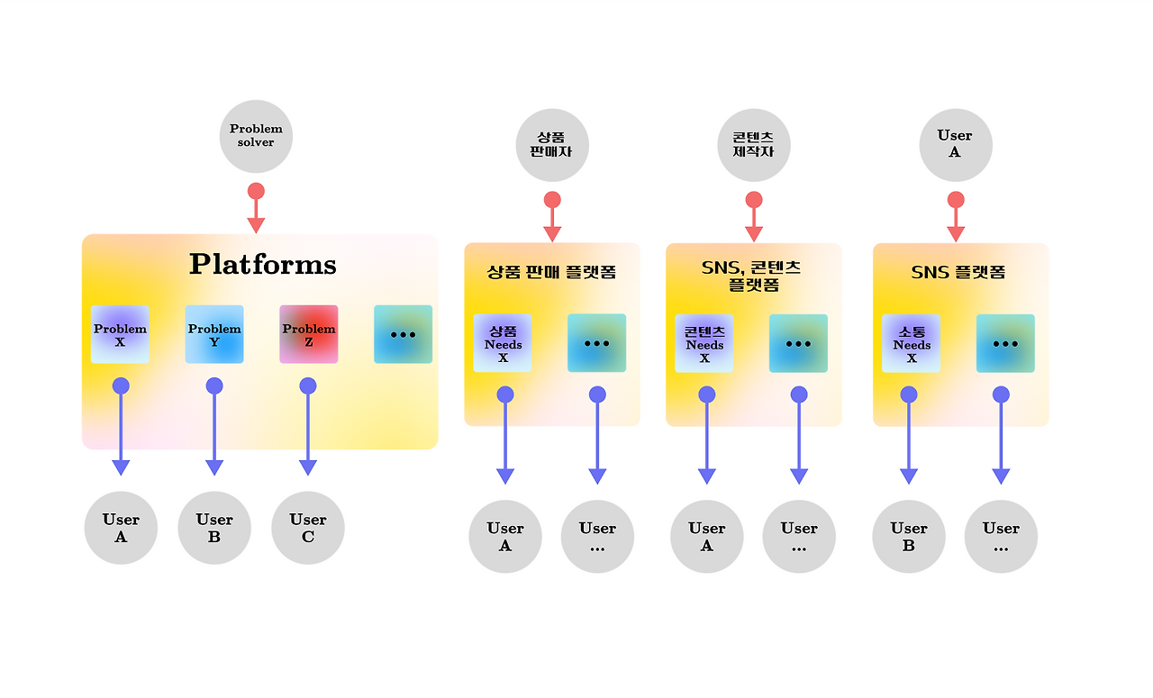 우리가 웹 혹은 앱을 통해 가장 흔하게 접하는 '다면 플랫폼'은, A라는 소비자 문제들의 덩어리를 해결하고자 하는 기업이, 모든 소비자의 문제를 맞춤형으로 해결할 수 없으니, 이 A라는 문제 덩어리 안에 작은 문제 x, y, z를 다른 소비자나 기업, 혹은 소비자 스스로가 해결할 수 있도록 장을 마련해 주고, 이 과정에서 각자가 원하는 이득을 가져갈 수 있도록 만든 정류장을 말합니다.
