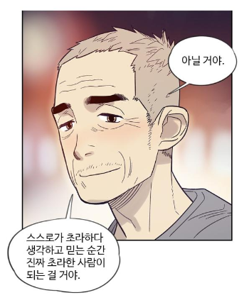 덕출이 처음 발레를 배우러 학원에 갔을 때 선생님께 하는 이야기입니다. 발레단의 ‘채록’ 이라는 20대 소년이 덕출과 함께 중요한 역할로 나오는데요. 재능이 있지만 인정해주지 않는 아버지와 넉넉하지 않은 집안 형편으로 발레에 전념하는 것이 쉽지 않은 아이입니다. 특히 채록은 덕출 할아버지에게 치매가 있다는 것을 가장 먼저 알게 되면서 덕출이 남은 인생을 모두 걸고 절박하게 매달리는 발레를 계속 할 수 있도록, 무대에서 멋지게 공연할 수 있도록 도우며 그 자신도 성장합니다. 이 책은 특히 공감에 탁월한 연출을 하는데요. 꽤나 자주 예상치 못하게 눈물이 터지는지라 이 웹툰 연재 시 사람들의 경고가 “절대 공공장소에서 보지 말 것” 이었다고 합니다.