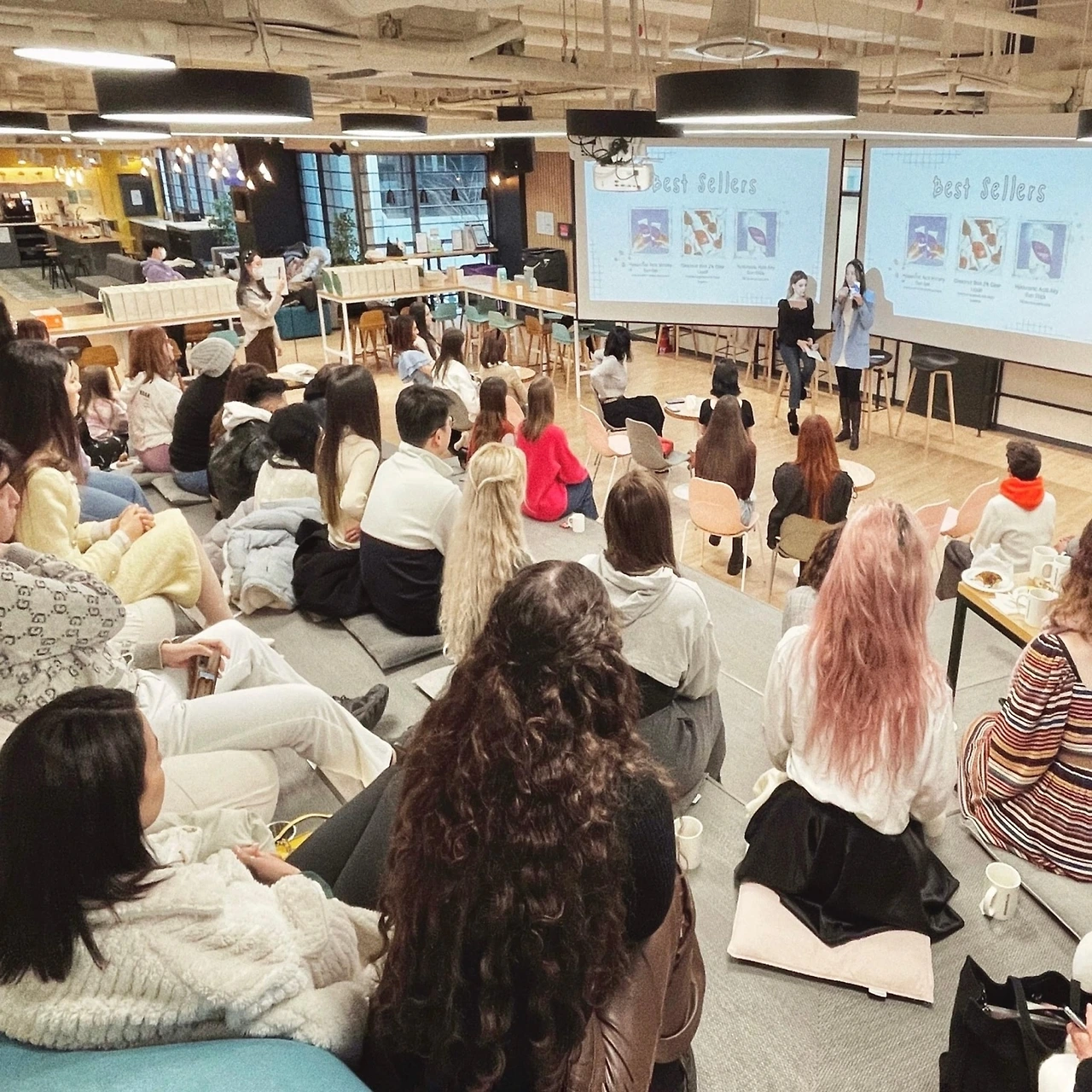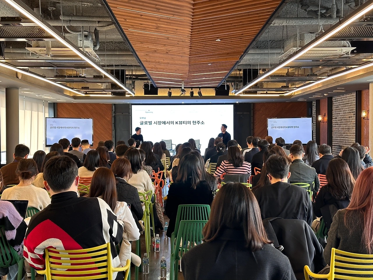 위시컴퍼니 그리고 피키라는 회사와 협업을 통해서 [100억 수출, 글로벌 브랜드로 가는 길]이라는 마케팅 세미나도 개최했습니다. 약 50여 개 뷰티 회사에서 100여 명의 실무진분들이 참여해주셨습니다. 누리라운지에서 활동하는 다섯 명의 크리에이터들이 진솔하게 본인의 경험담을 나누어주셨습니다.