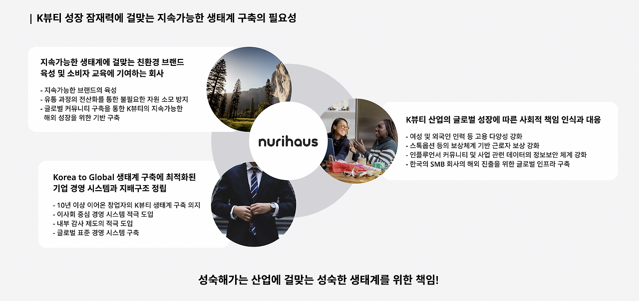 뷰티 산업은 그동안 선배들이 구축해온 다양한 경험이 누적되고 생산, 유통 등 다양한 부문의 인프라적 속성을 토대로 성장해왔습니다. 이 지점은 단순히 몇 가지 숫자로 설명할 수 없는 아주 중요한 요소이지요. 하지만, 현재 뷰티 산업에서 비어있는 요소는 무엇일지 생각해보니 누리하우스가 기여할 수 있는 영역이 분명히 보였습니다.