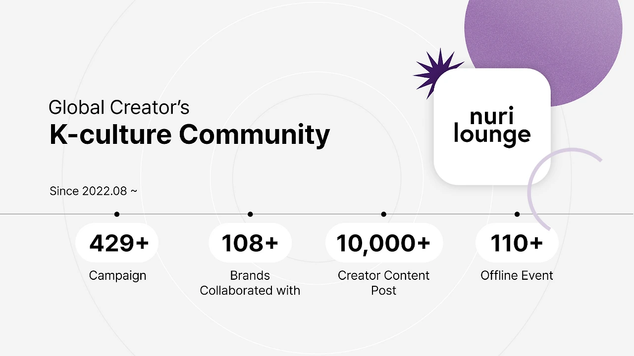 서울에 살고 있는 “K뷰티 관심도가 높은" 글로벌 크리에이터 커뮤니티로 커뮤니티의 정의를 좁힌 효과는 아주 명확했습니다. 커뮤니티에 참여하는 크리에이터들의 성향이 유시하게 모였고요. 온/오프라인 캠페인에서의 집적 효과도 더욱 효율적으로 변했습니다. 누리라운지 커뮤니티를 활용하고자 하는 고객사들도 커뮤니티에 기대하는 효과 또한 명확해졌고요. 여러 방면의 캠페인 운영에도 노하우가 쌓이면서 다양한 시도를 통해 타 경쟁사가 쉽게 진입할 수 없는 경험치들이 내부적으로 쌓이기 시작했습니다.