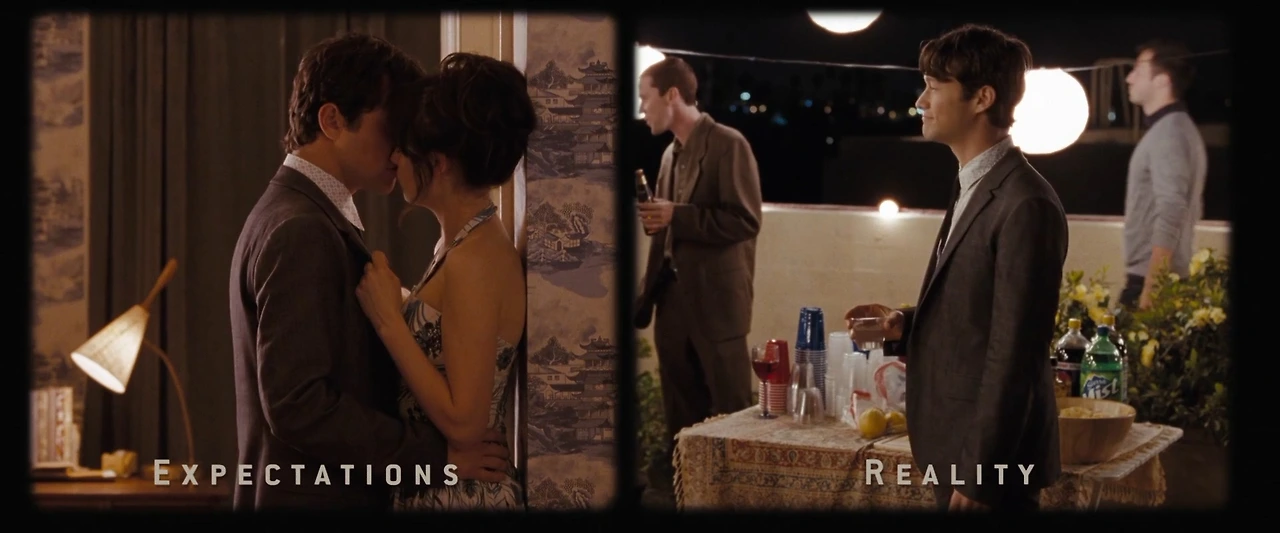 왼쪽 화면에서 톰은 썸머가 자신을 격하게 반겨줄 것이라 기대하지만 오른쪽에서 재생되는 현실은 미지근한 썸머가 보일 뿐이다.