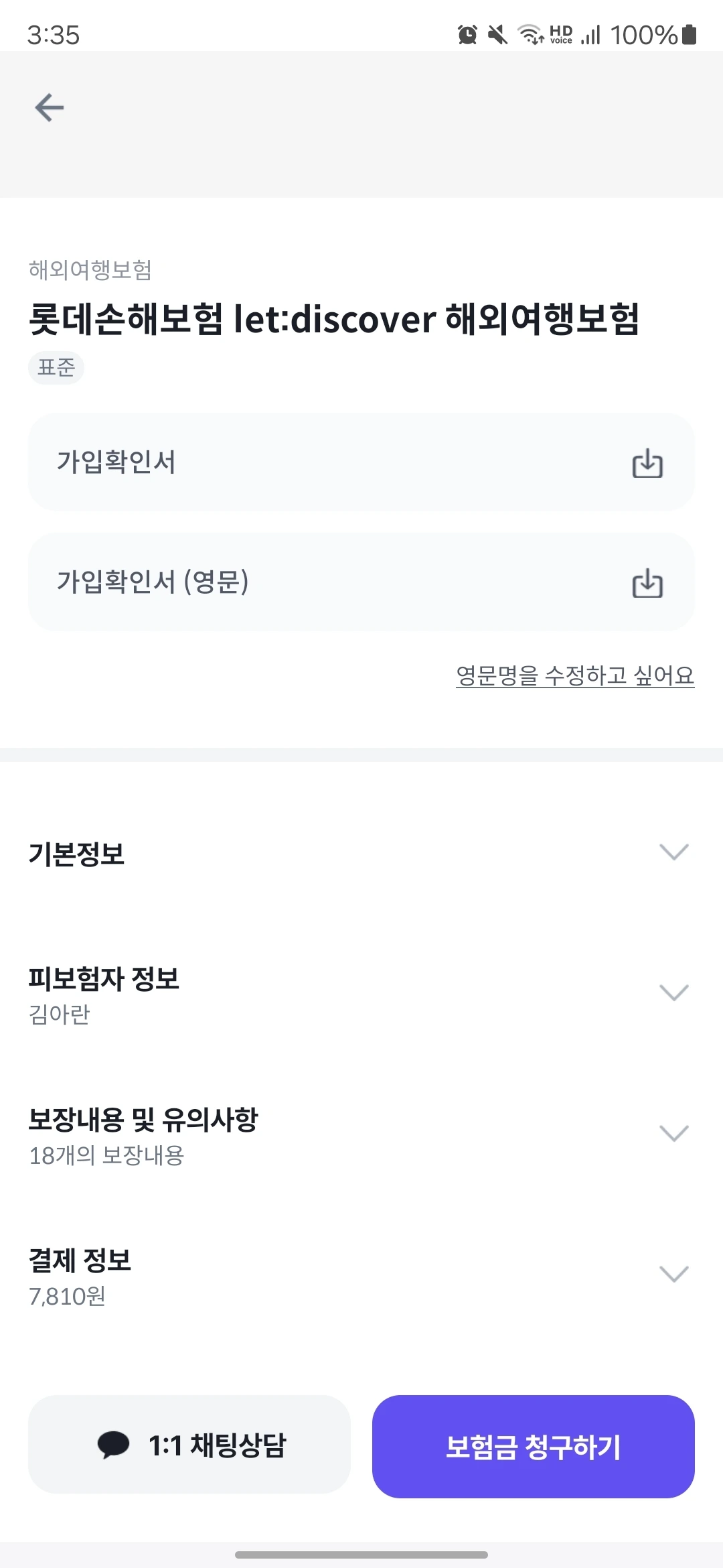 어디서 어떤 일이 생길지 모르기 때문에 [토글]이라는 어플을 통해 최저가 검색 후 18개 내용이 보장되는 여행자보혐을 7810원에 구매했다.