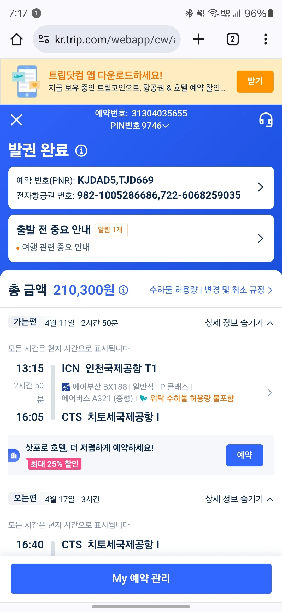 왕복 항공권 210300원 2024년 4 얼 11일 오후 1시 15분-->4월 17일 오후 4시 40분