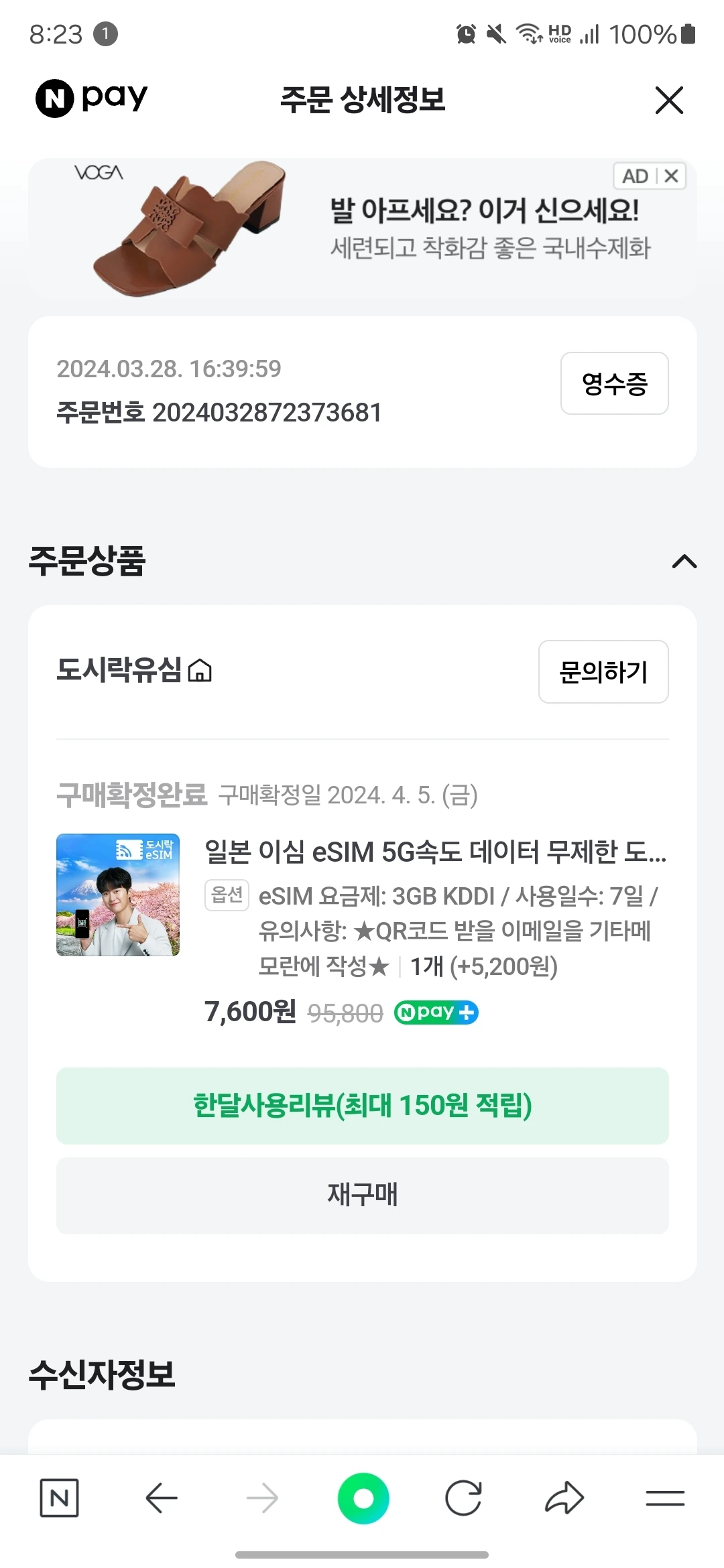 나는 제일 구매율이 높은 링크를 눌러 최저가의 유심구매를 했다.