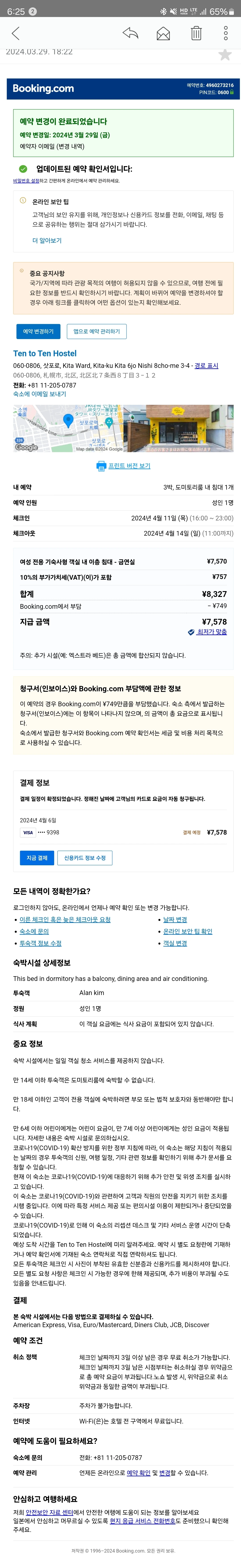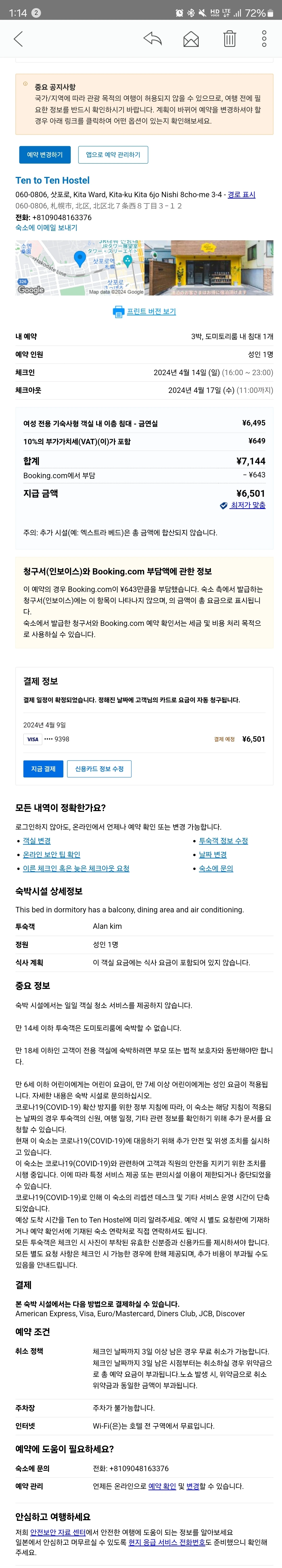 결제하고 나서 고민하다가 금액차이가 커 도미토리숙소 연박으로 변경하였다.