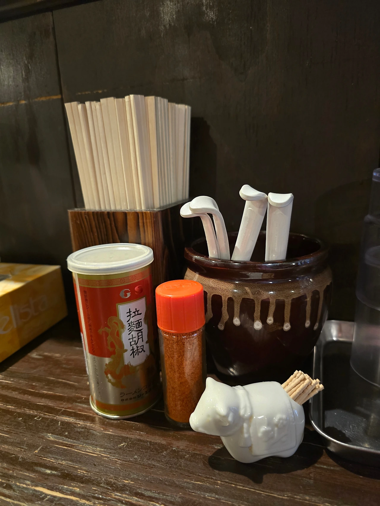 1인석 자리는 조리대 앞쪽 바 형태로 나와있었는데 짐을 두는 바구니도 있고 냅킨도 있었다. 나중에 알게 된 게 있는데 일본에서는 음식을 먹을 때 사용한 냅킨을 식탁에 두면 안 된다고 한다. 냅킨 사용 후 산더미처럼 쌓아두었었는데 그 냅킨은 근처에 있는 휴지통에 버리는 게 매너라고 한다. 내 냅킨을 보고 그들이 기분 나쁘지 않았길..