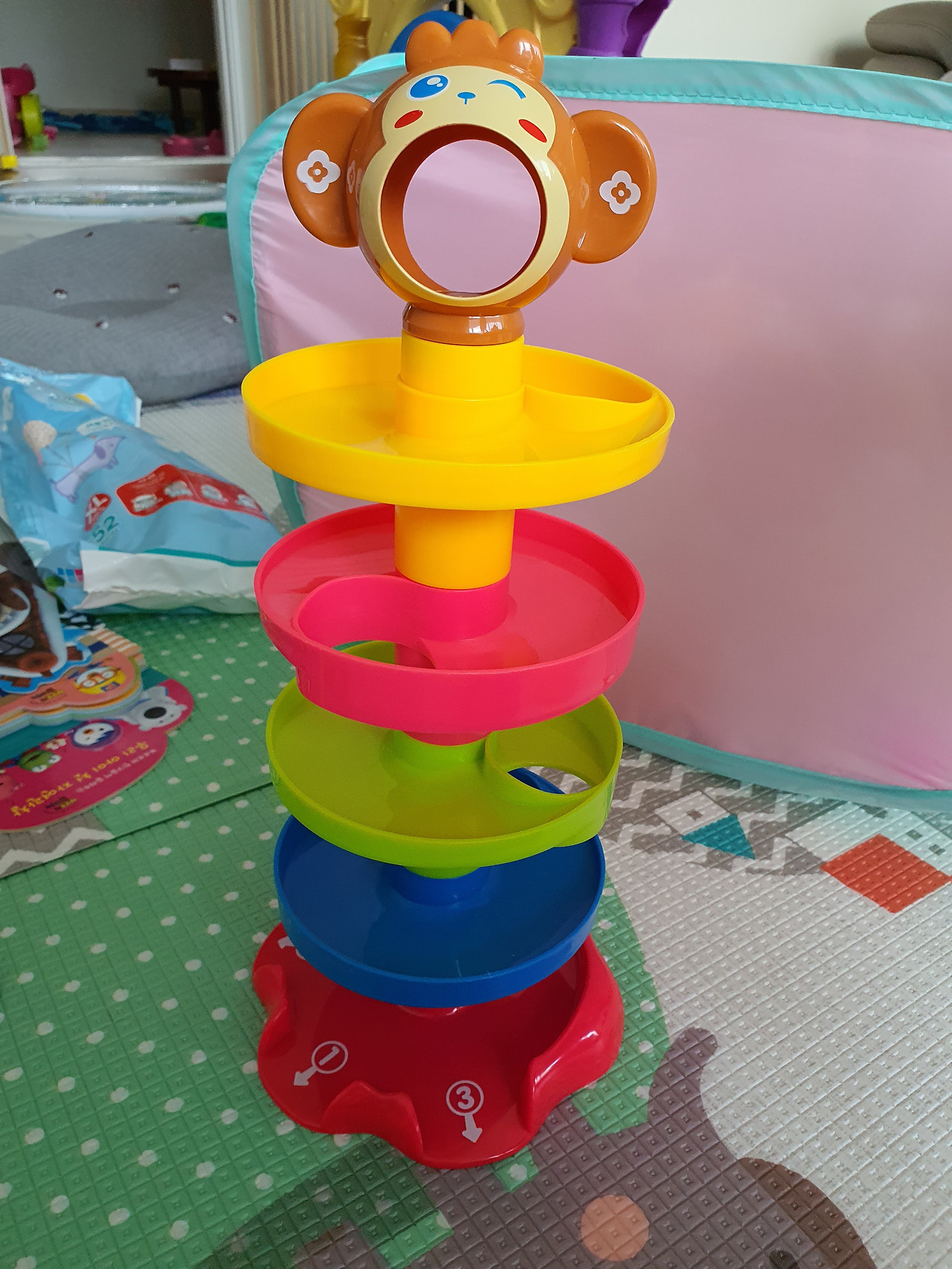 밤토리는 뱅글뱅글 공이 굴러가는 이 장난감에 공을 계속 넣으며 재밌어했다. 내려가는 공을 끝까지 눈으로 따라가며 신기해했다. 아기가 장난감의 흥미를 갖기 시작할 때가 바로 언어적 자극을 주기에 아주 적절한 타이밍이다.
