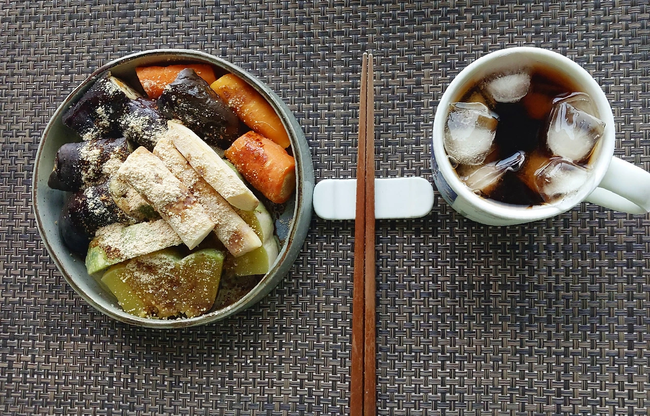 아침은 가지와 호박과 당근 쪄서 치즈 올리고 발사믹식초와 콩가루 뿌리다. 냉커피와 함께.