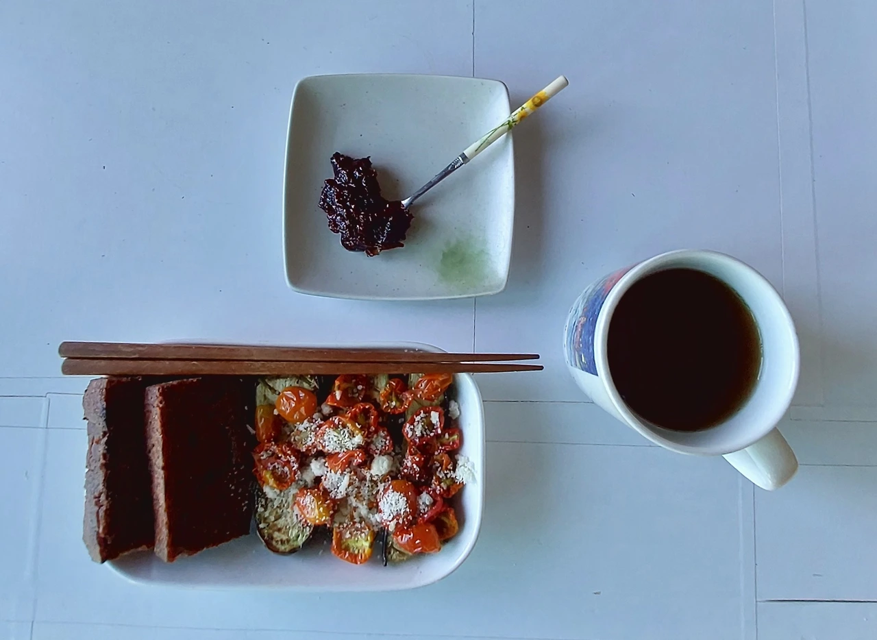 아침은 옥수수빵에 가지 구워서 말린 방울토마토 곁들였다. 그리고 커피와 산딸기잼.