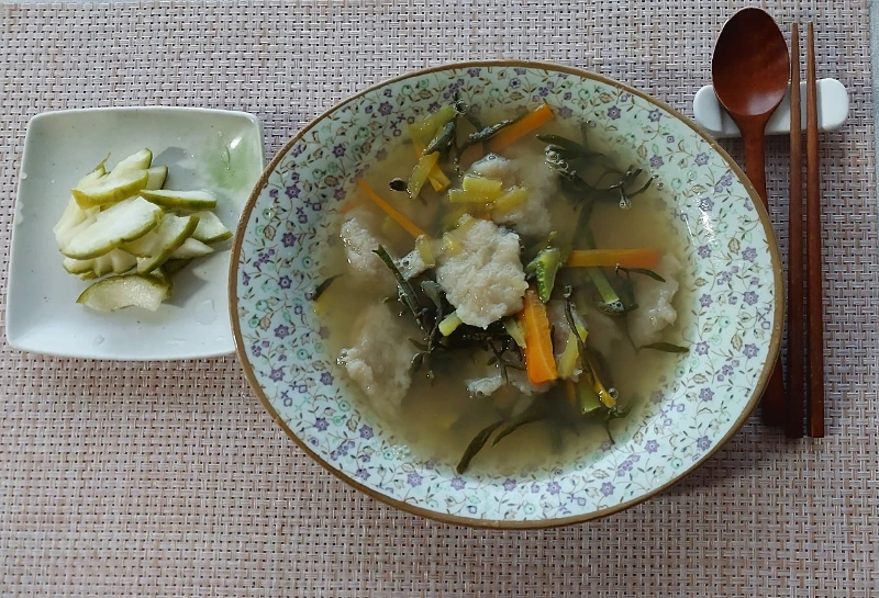 진심을 담아 감자를 강판에 갈고 인내심을 끌어올려 감자물을 가라앉혀 전분을 긁어내고, 밀가루를 보태 반죽해서 육수에 호박과 당근, 뜸부기 넣고.... 소금 간으로 완성