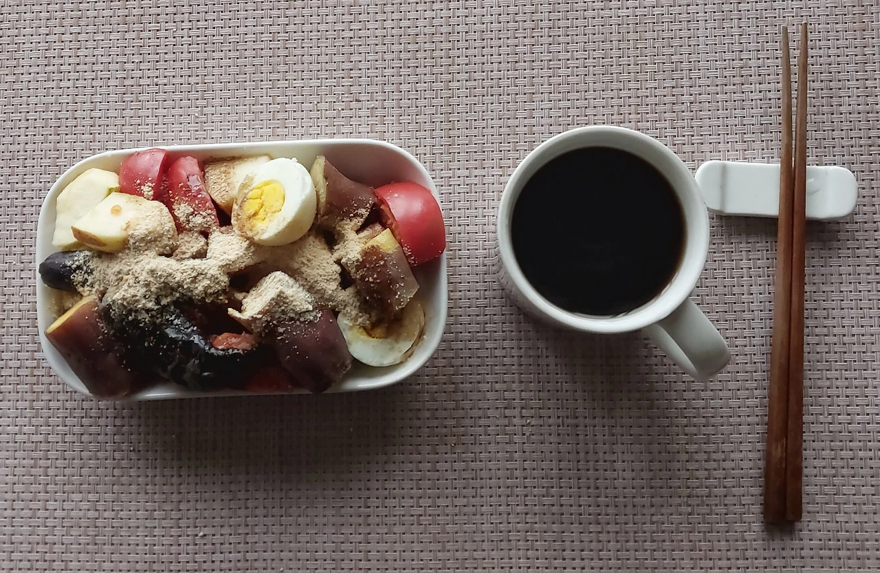 계란과 고구마와 건가지와 당근을 찜기에 올려 익히고, 토마토와 사과 반쪽을 넣고 발사믹식초와 콩가루를 뿌렸다.