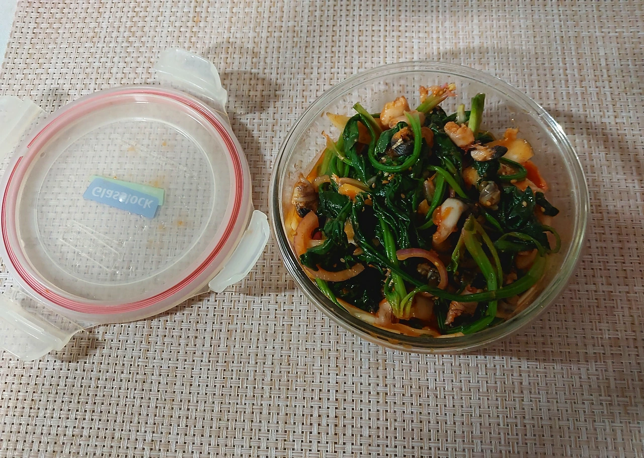 점심은 거북손과 고동이 듬뿍 들어간 시금치무침. 친히 갱번에서 캐고 씻고 삶고 무치신 어르신의 솜씨다.