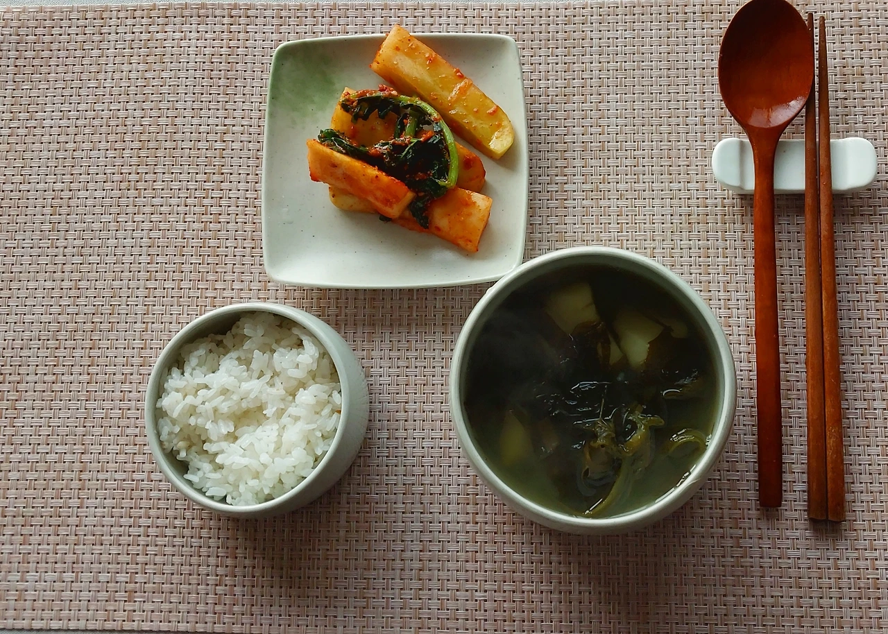점심은 옆집에서 주신 무김치에 감자 넣은 미역국으로.
