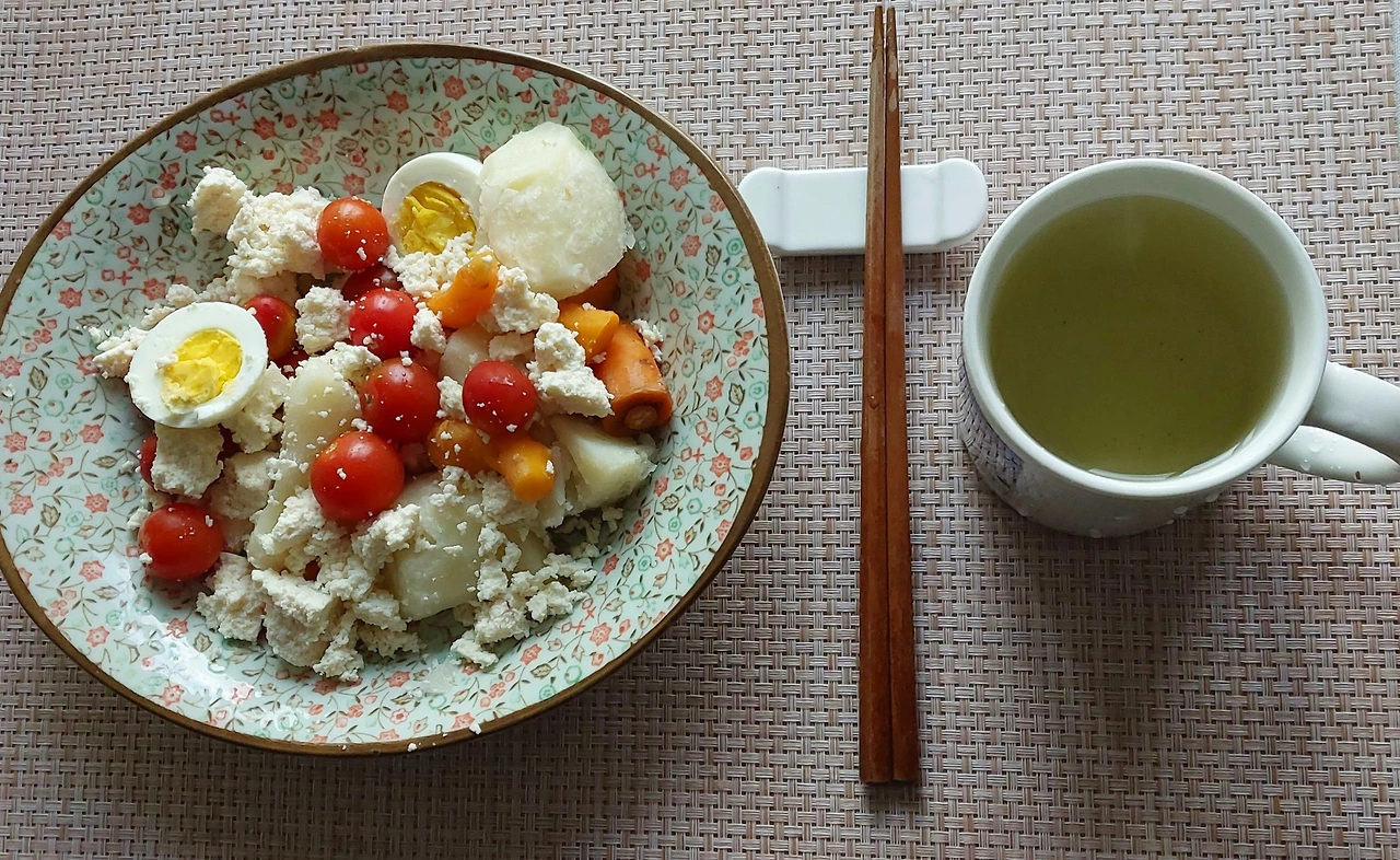 아침은 감자와 계란, 당근 익혀서 치즈와 방토 올렸다. 소스는 없이 쑥차와 함께.