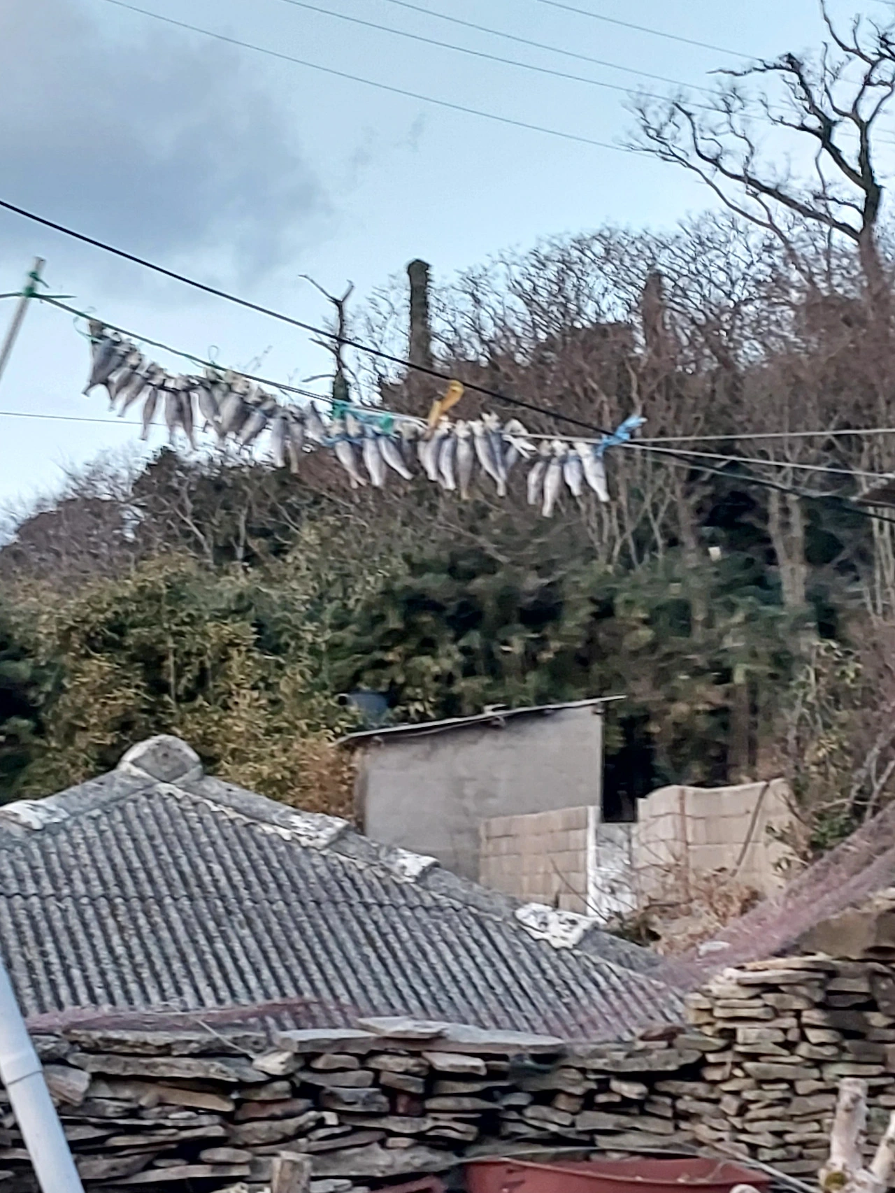 오후에 산책하다 만난 동네 풍경이다. 고양이를 피해 장대 높이 걸린 생선들... 추운데 고생이 많다.