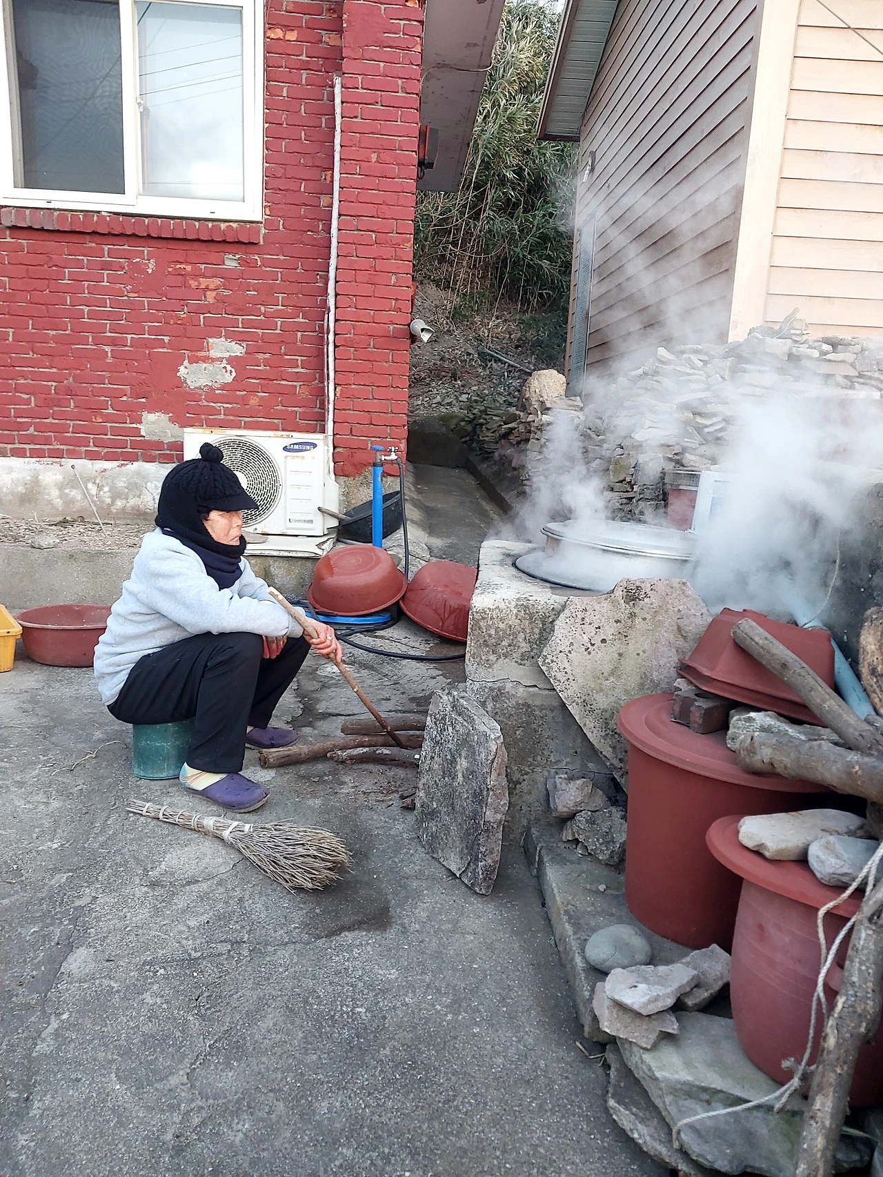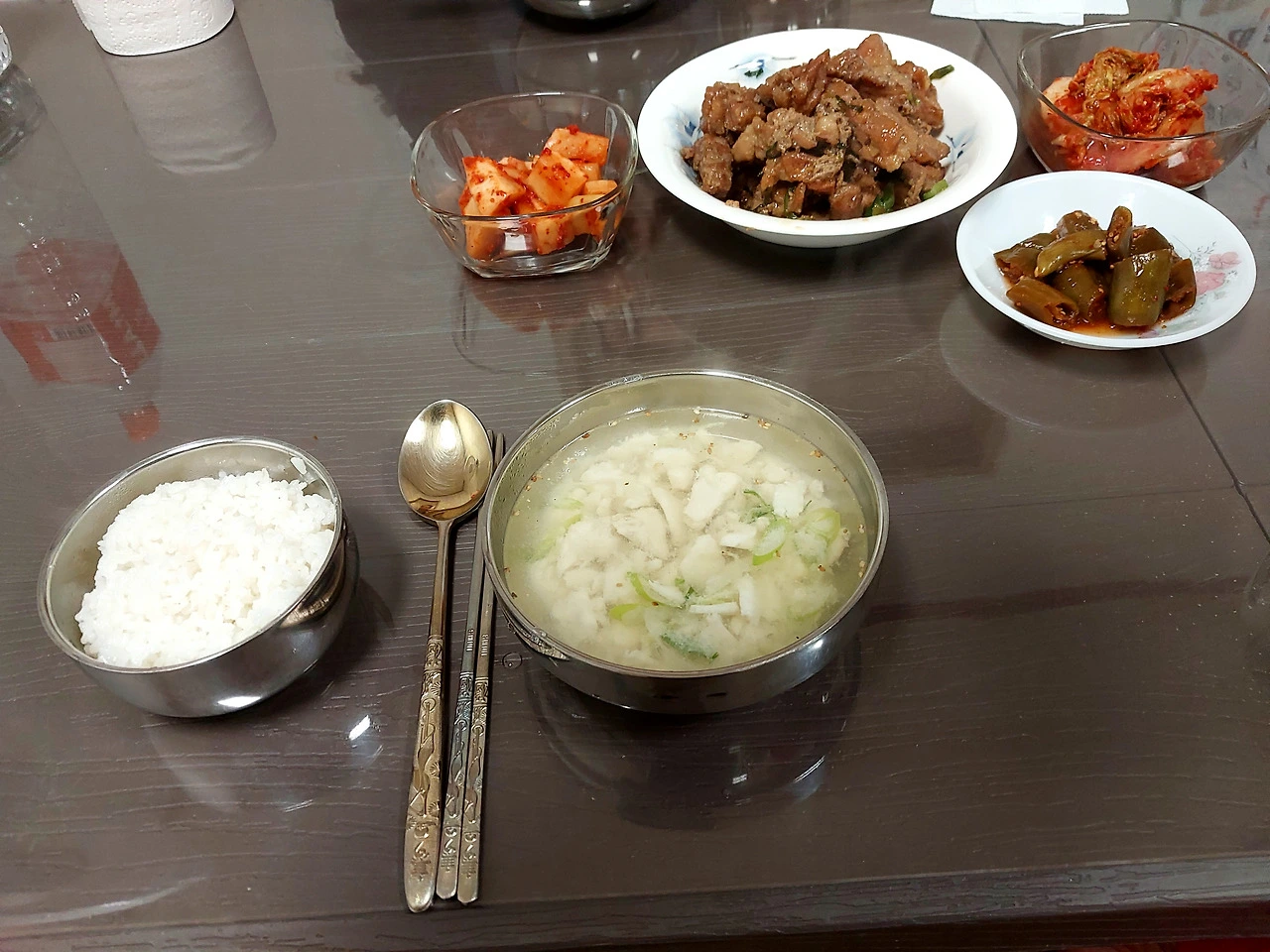 점심은 회관에 모여서 ... 돼지고기 볶고 냉동실 뒤져 생선회 뜨고 남은 생선으로 생선국.