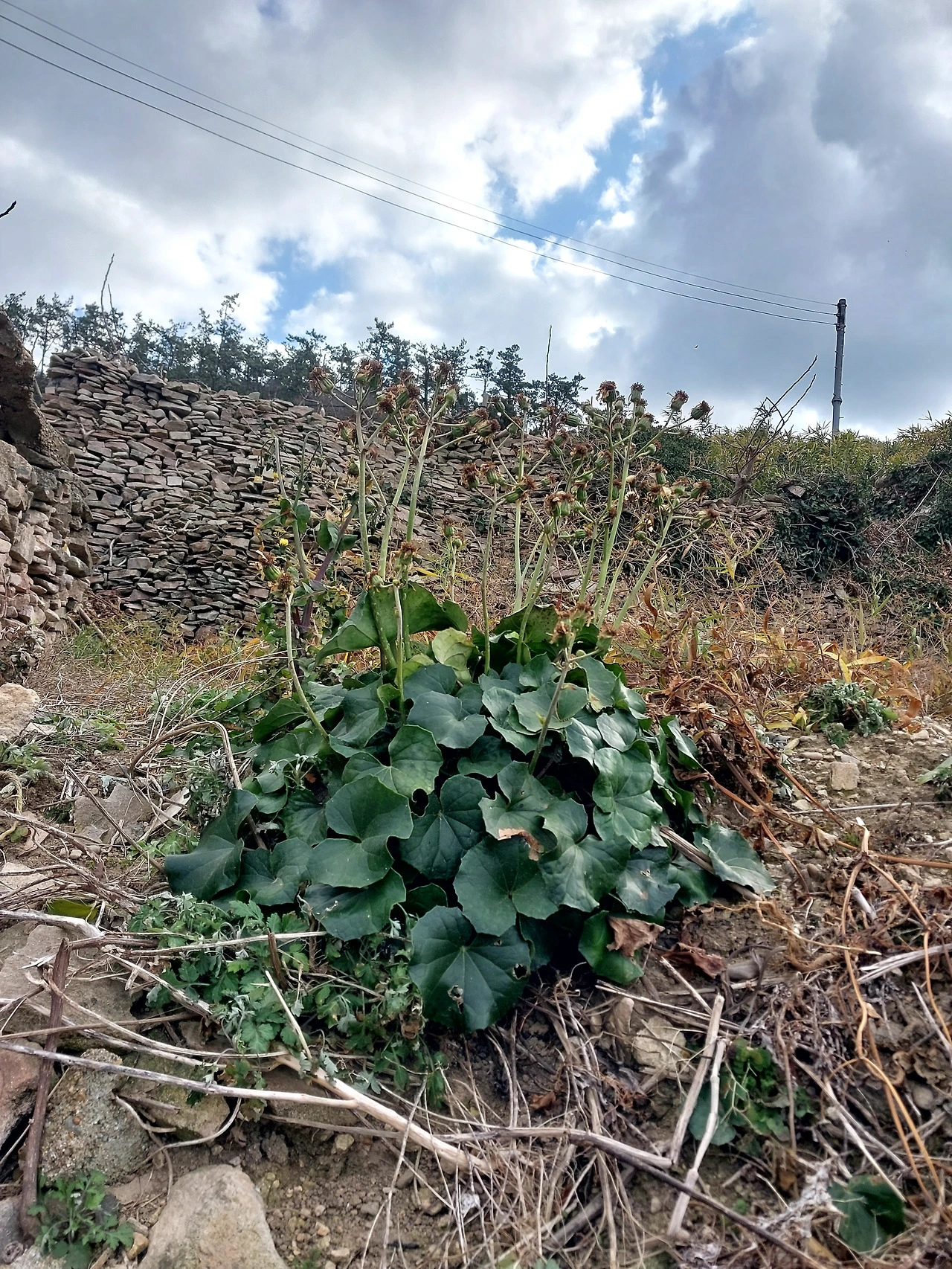 점심은 회관에서 돈두죽으로. 이게 돈두라는 식물이다. 겨울에도 짙은 초록으로 싱싱하고 가을에는 노란 꽃이 핀다. 이걸 삶아서 홍어내장이나 가자미 내장을 넣고 쌀이랑 떡국도 넣고 된장 풀어서 끓이면 죽이 된다고 들었음.