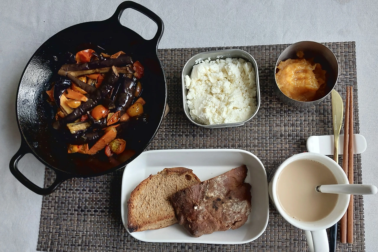 호밀빵 버터에 굽고 만든 치즈와 귤잼, 그리고 커피 내려 우유랑 섞고