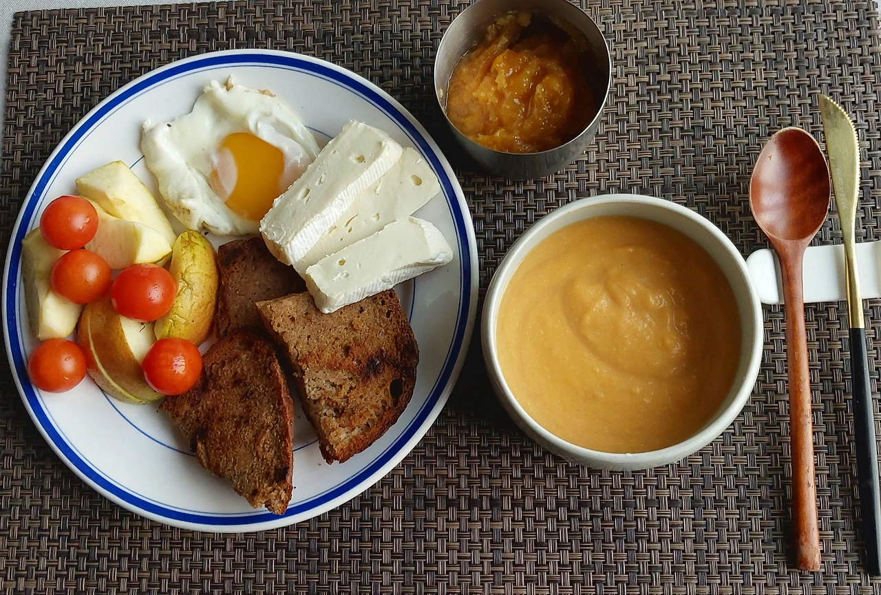 아침은 호밀빵 굽고, 계란프라이와 치즈, 귤잼 그리고 호박 갈아둔 것에 우유 좀 섞어서 끓이고 소금간으로.