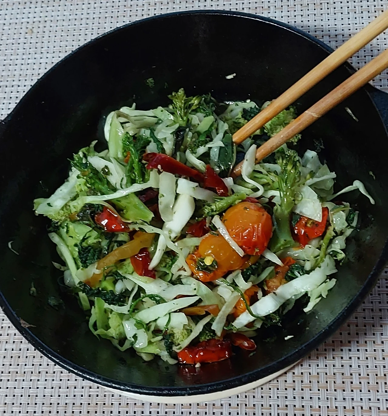 아침은 냉동실에 있는 말린 야채들, 시금치, 파프리카, 브로콜리, 방울토마토 꺼내