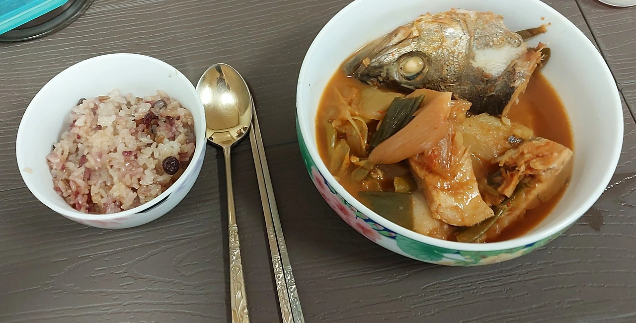 찰밥과 생선조림. 여기서 잡은 농어를 무와 김치 약간 넣어 졸이심.