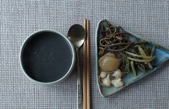 아침은 흑임자죽과 고사리, 양파, 달래, 그리고 머위피클.