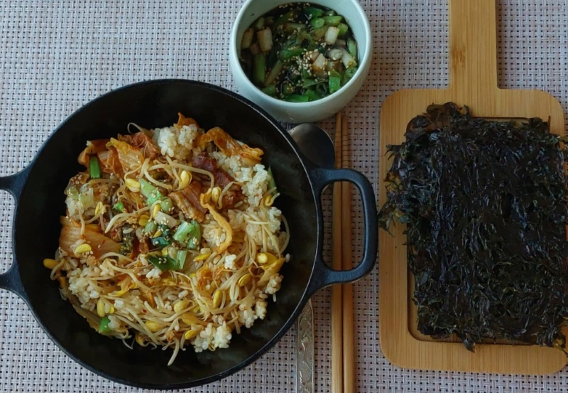 치와 돼지고기 다글다글 볶아서 콩나물과 함께 밥을 짓고