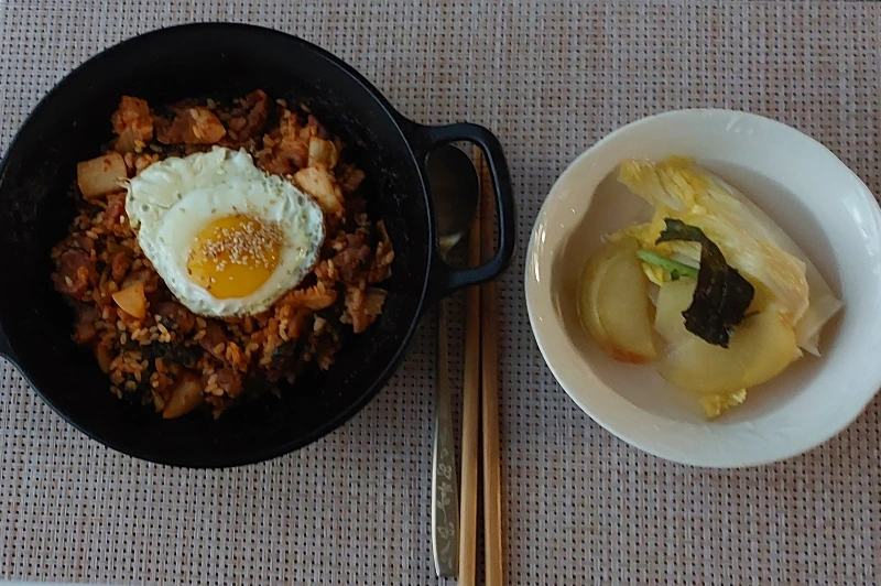 점심은 시어 빠진 깍두기와 밥, 돼지고기 남은 것을 달달 볶았다. 이제 막 익기 시작한 물김치와 함께.