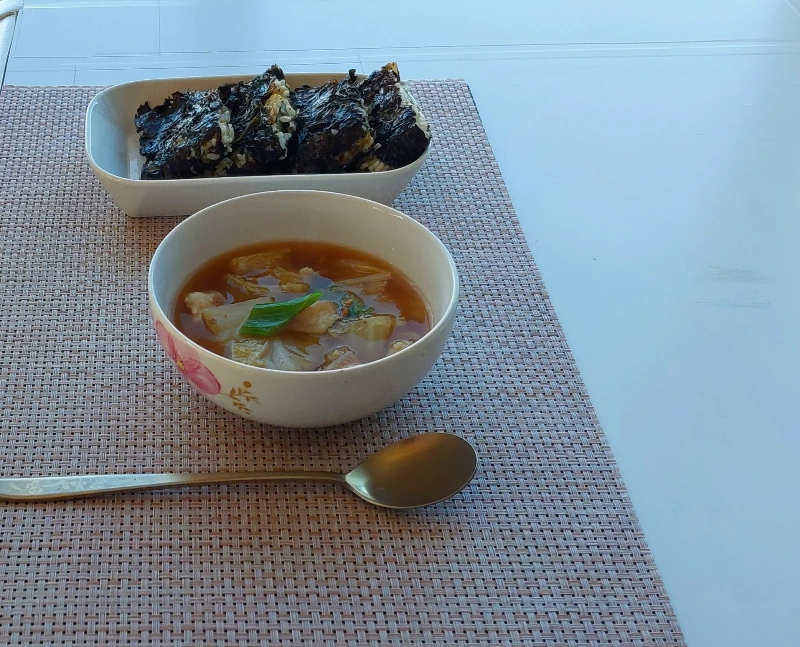 점심은 어제 남은 취나물밥에 김치를 넣은 납작 김밥과 배춧국.