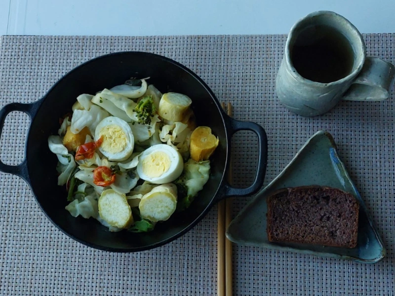 아침은 달걀, 고구마, 양배추, 바질, 브로콜리, 방울토마토, 한데 섞고 식빵과 칡순차.