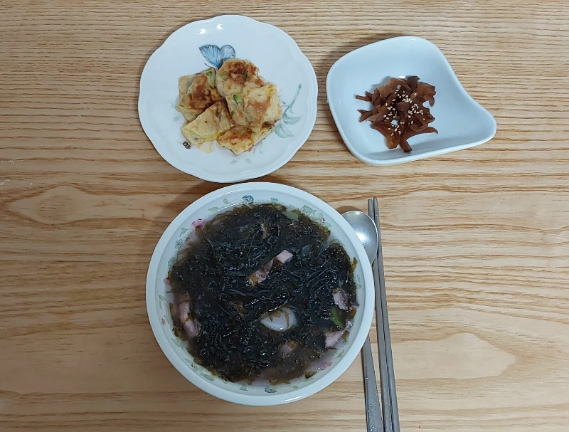 아침은 섬에서 주신 물김으로 숭어와 떡국을 넣어 끓였다. 마늘 넣고 들기름으로 마무리. 냉동실에 있던 전 데우고.... 무장아찌와 함께. (본가에 왔다. 이 말인즉 이제 식사는 나 위주가 아닌 식구 위주라는 뜻.)