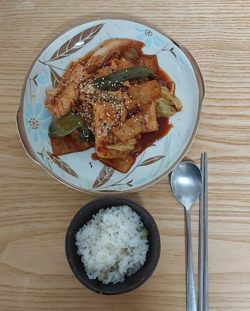 간장과 고추장, 물 섞고 올리고당 조금 끼얹어 끓이다. 그리고 파와 양배추, 어묵도 그저 있으니 있는 대로.