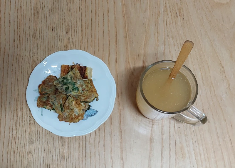점심은 어제 부쳐놓은 전, 유자차