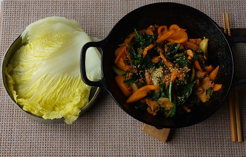 점심은 닭고기와 시금치, 부추, 깻잎, 파프리카, 양파 넣고 매콤하게 볶아서... 익힌 배추쌈으로.