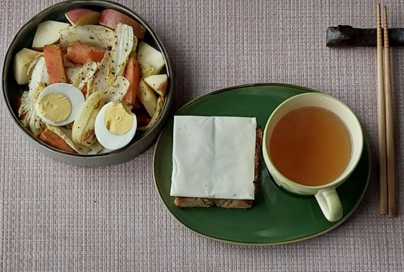 아침은 어제 만든 식빵에 치즈와 잼, 귤피차 그리고 배추와 당근 익혀서 들깨 뿌리고 사과와 계란.