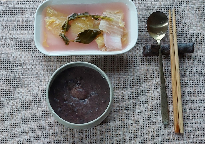 비 오는 아침, 새알심 넣고 팥죽 진하게 끓이고 새콤하게 익은 물김치하고 먹다.