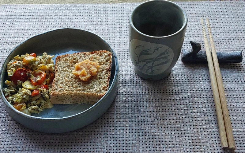 아침은 식빵과 잼, 계란과 방울토마토, 바질 볶음 그리고 수세미차