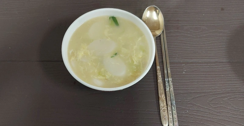 점심은 어제 회 뜨고 남은 생선뼈를 우린 국물에 떡국. 회관에서 함께 먹다.