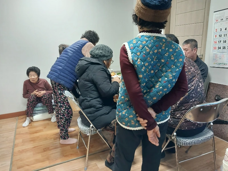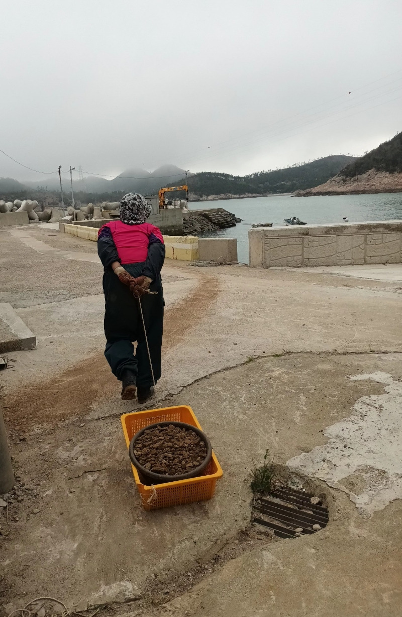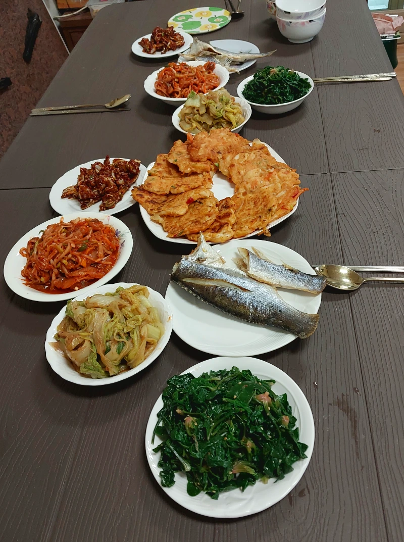 점심은 회관에서... 갓 잡은 생선들로 찜, 게장, 생선 야채 전, 농어지리탕, 숭어회무침, 시금치, 배추무침 등,