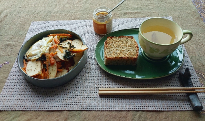 아침은 식빵과 사과, 당근, 말린 뽕잎 약간 익혀서 들깨 뿌리고... 귤피차. 사과는 처음 익혀봤는데 괜찮았다.