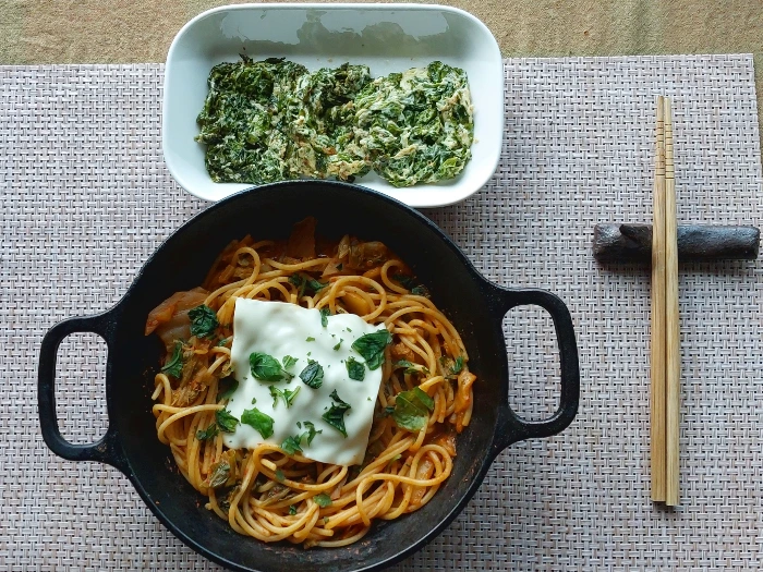 점심은 스파게티 면 삶아서 남은 김치찌개 넣고 달달 볶아서 바질, 치즈 올리고, 물김에 계란 풀어 부치다.