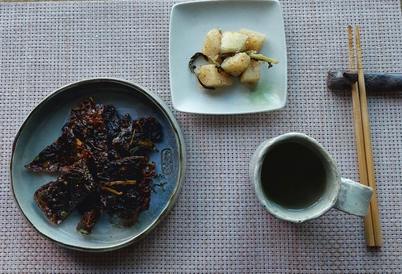 아침은 도토리가루에 당근과 물김 넣고 전 부치다. 그리고 와송차와 깍두기.