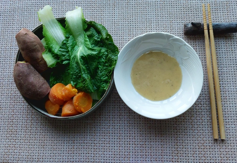 고구마와 당근, 봄동을 찜기에 찌고 소스 곁들이다.