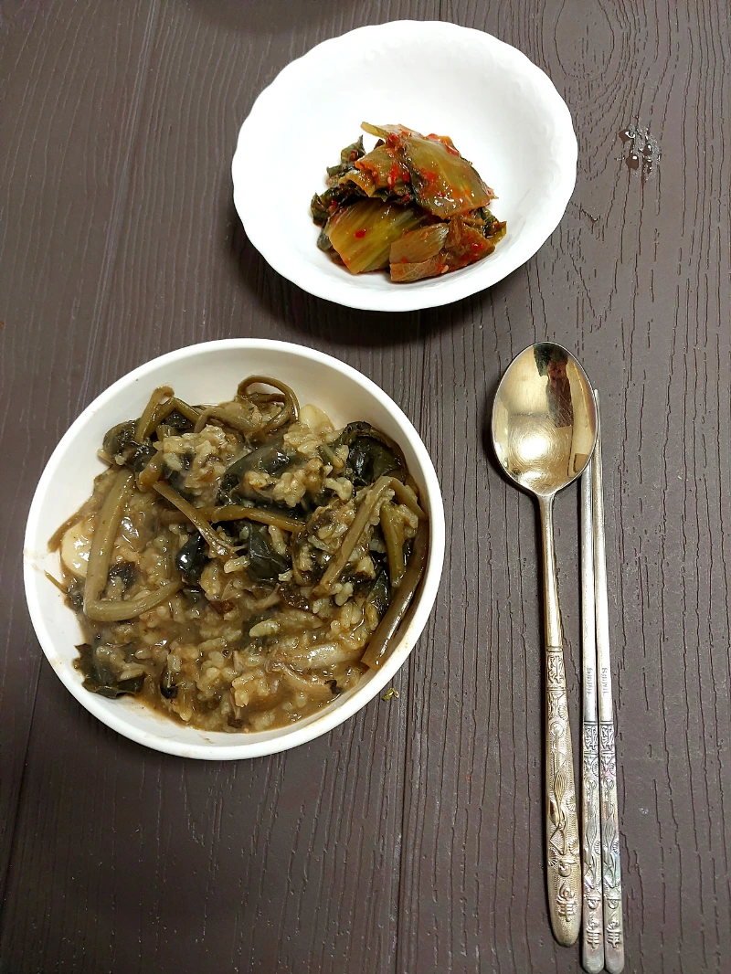 점심은 회관에서 어르신께서 끓여주신 돈두죽과 갓김치. 여기서 자라는 식물인 돈두(라고 하심)와 생선 내장 삭힌 것에 쌀과 떡국떡을 곁들여 끓인 겨울철 별미다.