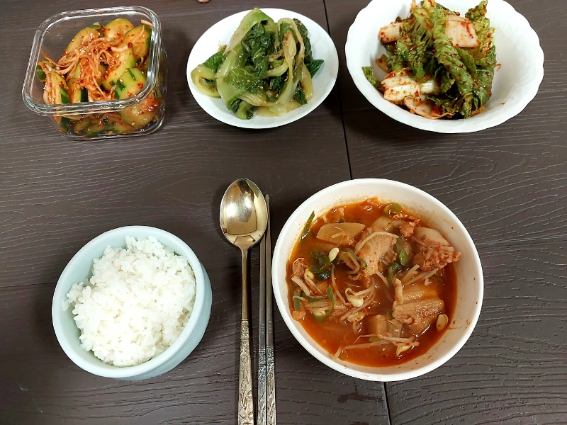 오늘은 저녁까지 회관에서 먹다. 봄동겉절이와 배추나물, 오이무침 그리고 김치찌개.