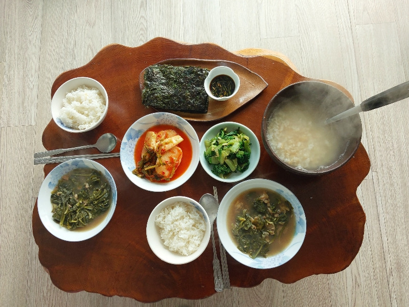 어제 남긴 된장국과 봄동무침, 알맞게 익은 무김치 그리고 누룽지와 숭늉.