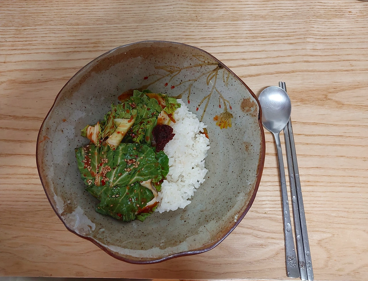 점심은 봄동에 고추장 넣고 비빔밥.