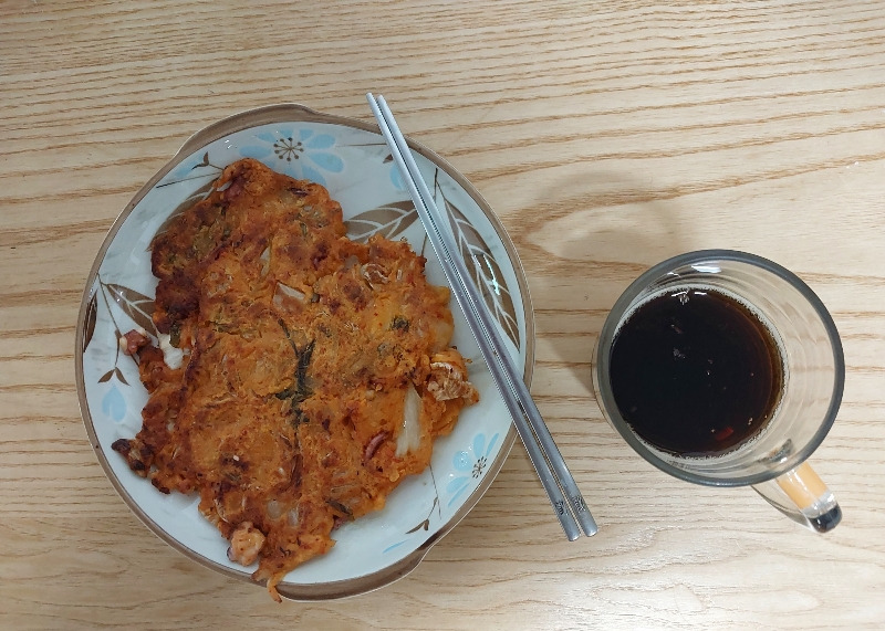 점심은 낙지 넣은 김치전과 콜라.