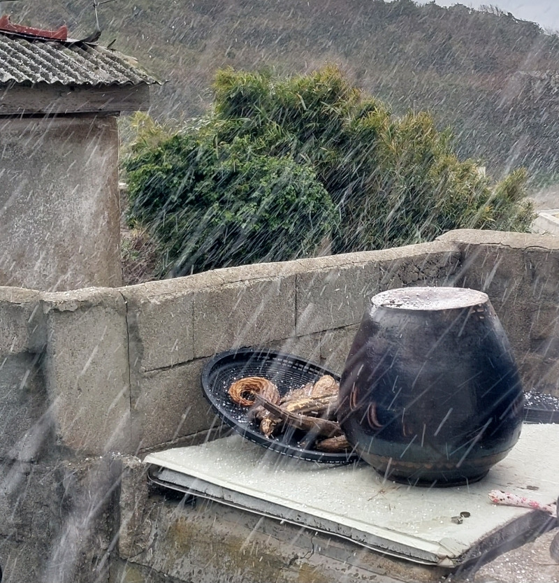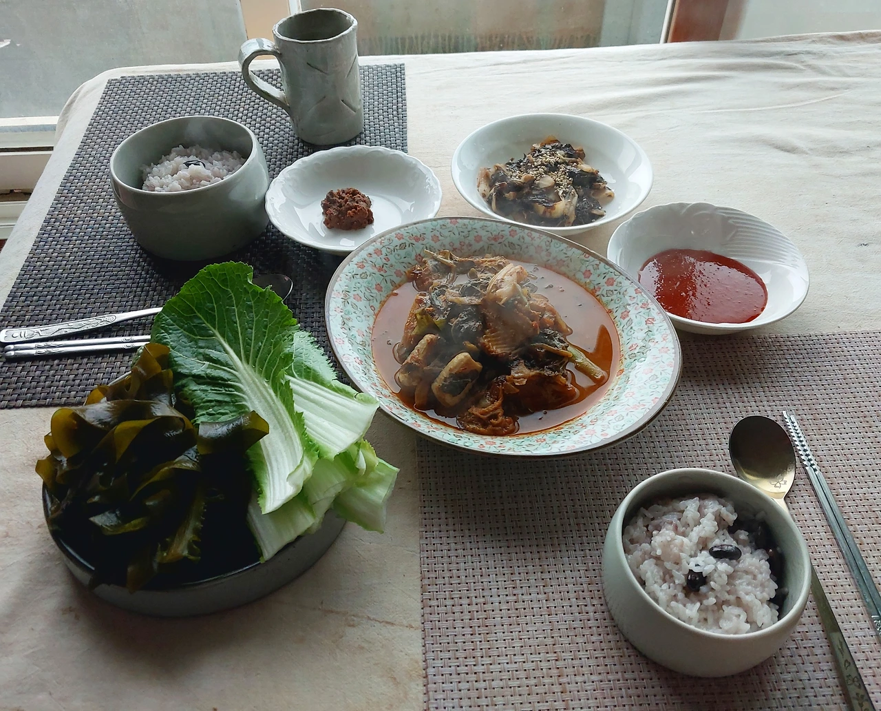 점심은 남은 김치찌개 데우고 봄동과 미역쌈.